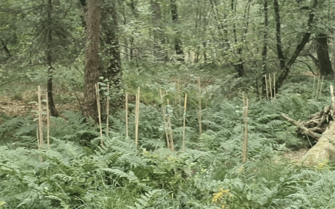 Op de foto ziet u bamboestokken staan die de jonge aanplant beschermen tegen vraat van reeën en herten. Deze stokken bemoeilijken het eten van de jonge loofboompjes die erg in trek zijn bij het wild. Het mooie van deze bamboestokken is dat het gaat om een natuurproduct dat na een kleine tien jaar vanzelf vergaat. Dit in tegenstelling tot plastic beschermkokers die handmatig moeten worden verwijderd.